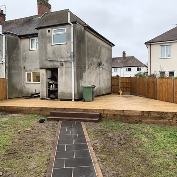We have totally transformed this tired, worn down and unloved garden for this lovely couple. Raised decking area that wraps around the customers house. Lined with sleepers and integral steps, leading on to an inviting path that links to a large patio area. The patio is also lined with sleepers and consists of a random pattern. Power was also installed but not connected as requested by the customer for possible future use.
